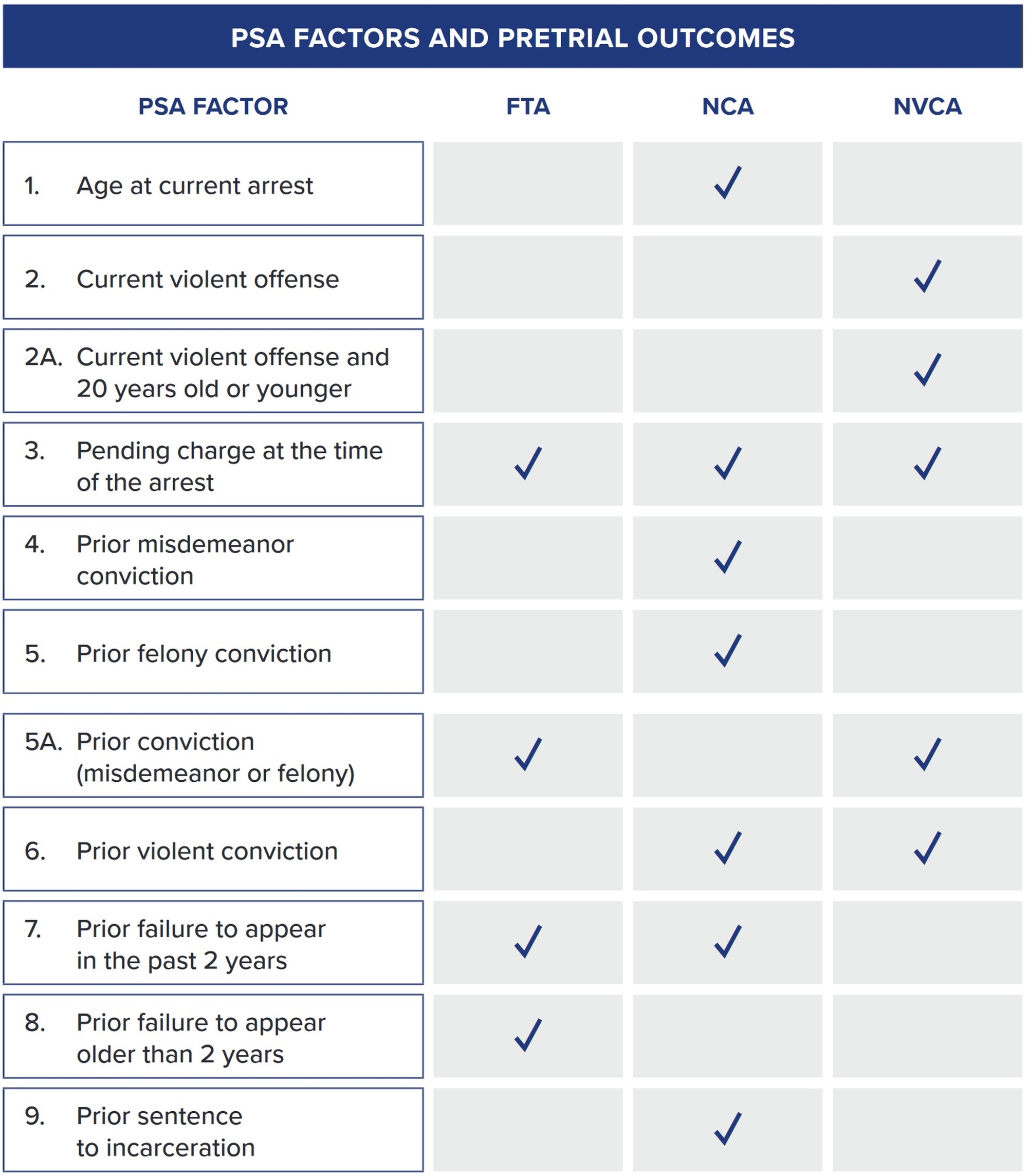 A combination of different factors is used to predict the likelihood of three pretrial outcomes: Failure to Appear (FTA), New Criminal Arrest (NCA), and New Violent Criminal Arrest (NVCA).