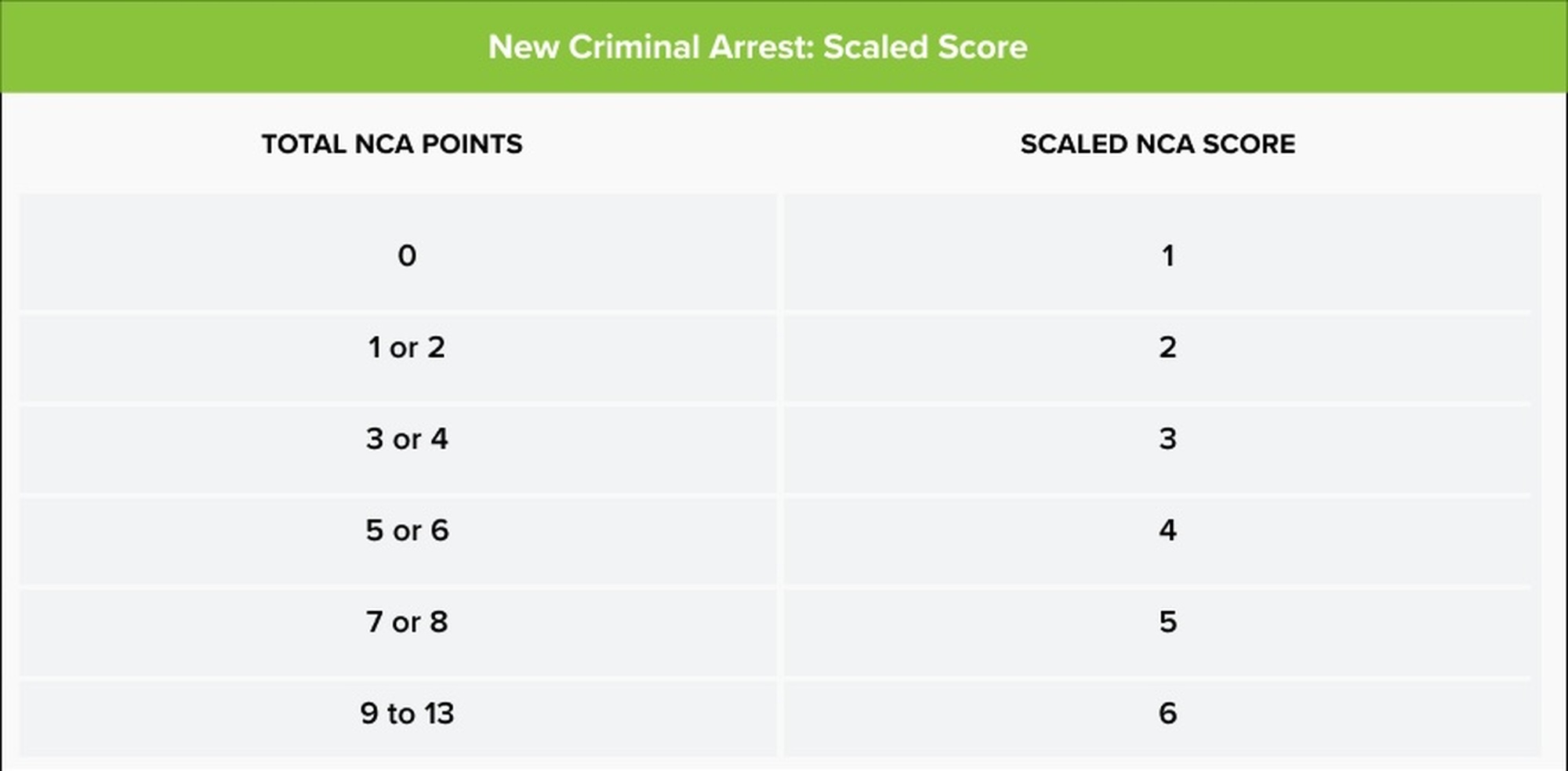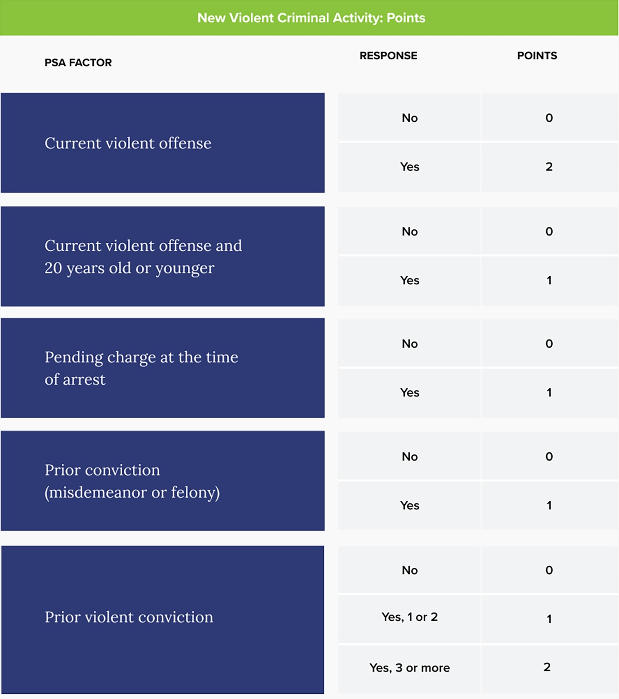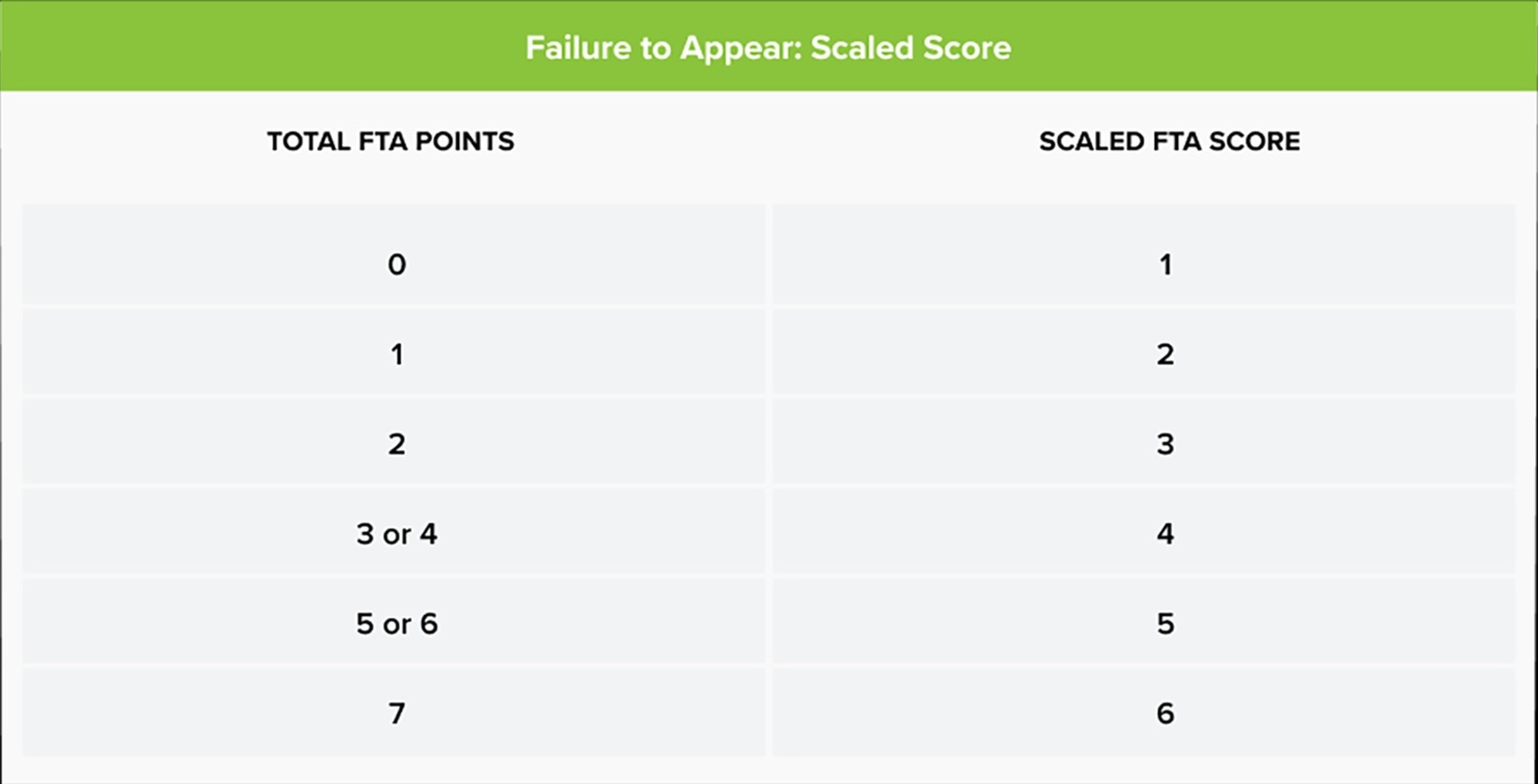 Each PSA factor is weighted and assigned different points according to the strength of its relationship with the specific pretrial outcome. At the end of the assessment, the points for each pretrial outcome are totaled. The total points assigned to FTA and NCA are then converted to two separate scales ranging from 1 to 6. Lower scores indicate a greater likelihood of pretrial success. The points assigned to NVCA are converted to a scaled score and then to the presence or absence of a “violence flag." The tables below show how the PSA assigns points to the factors and then converts them to scaled scores.
