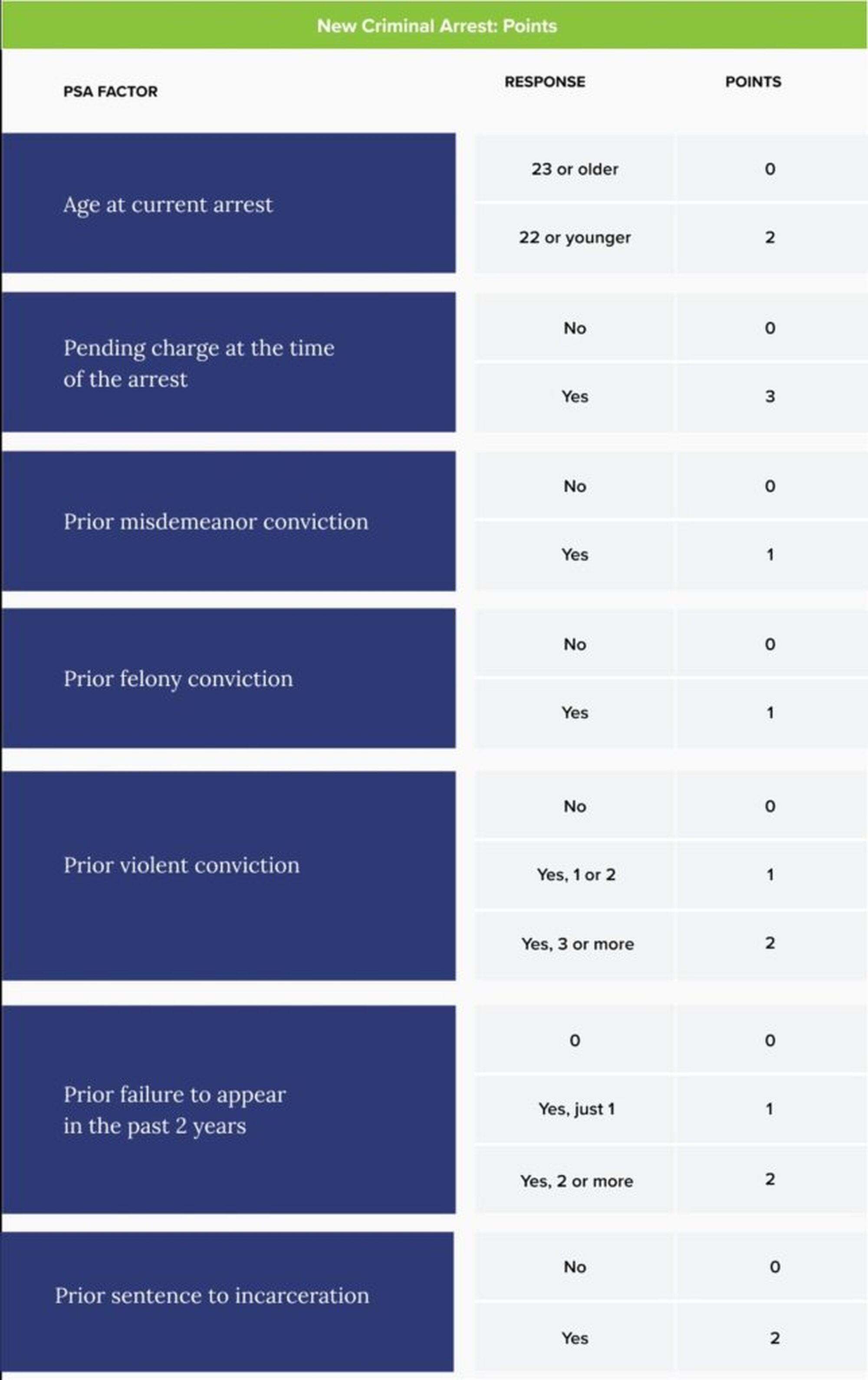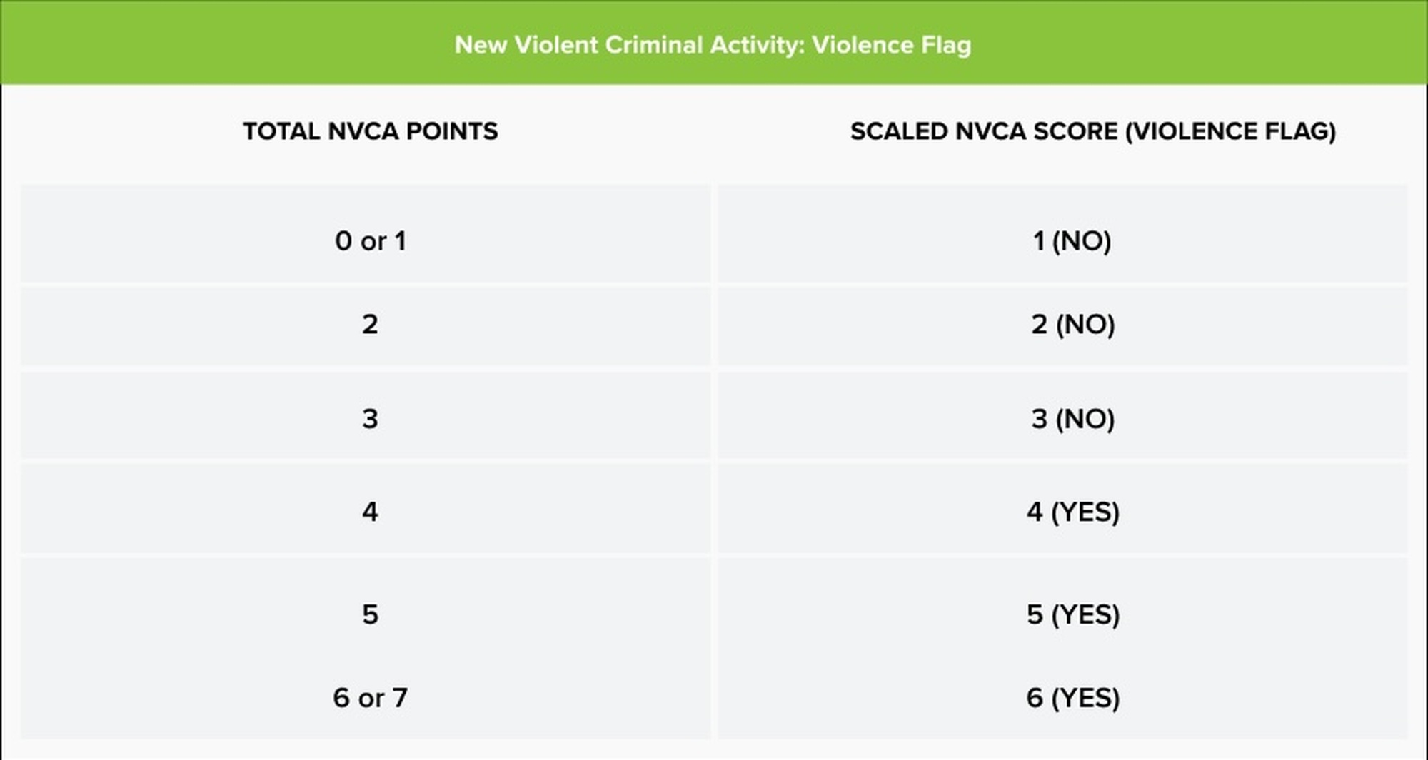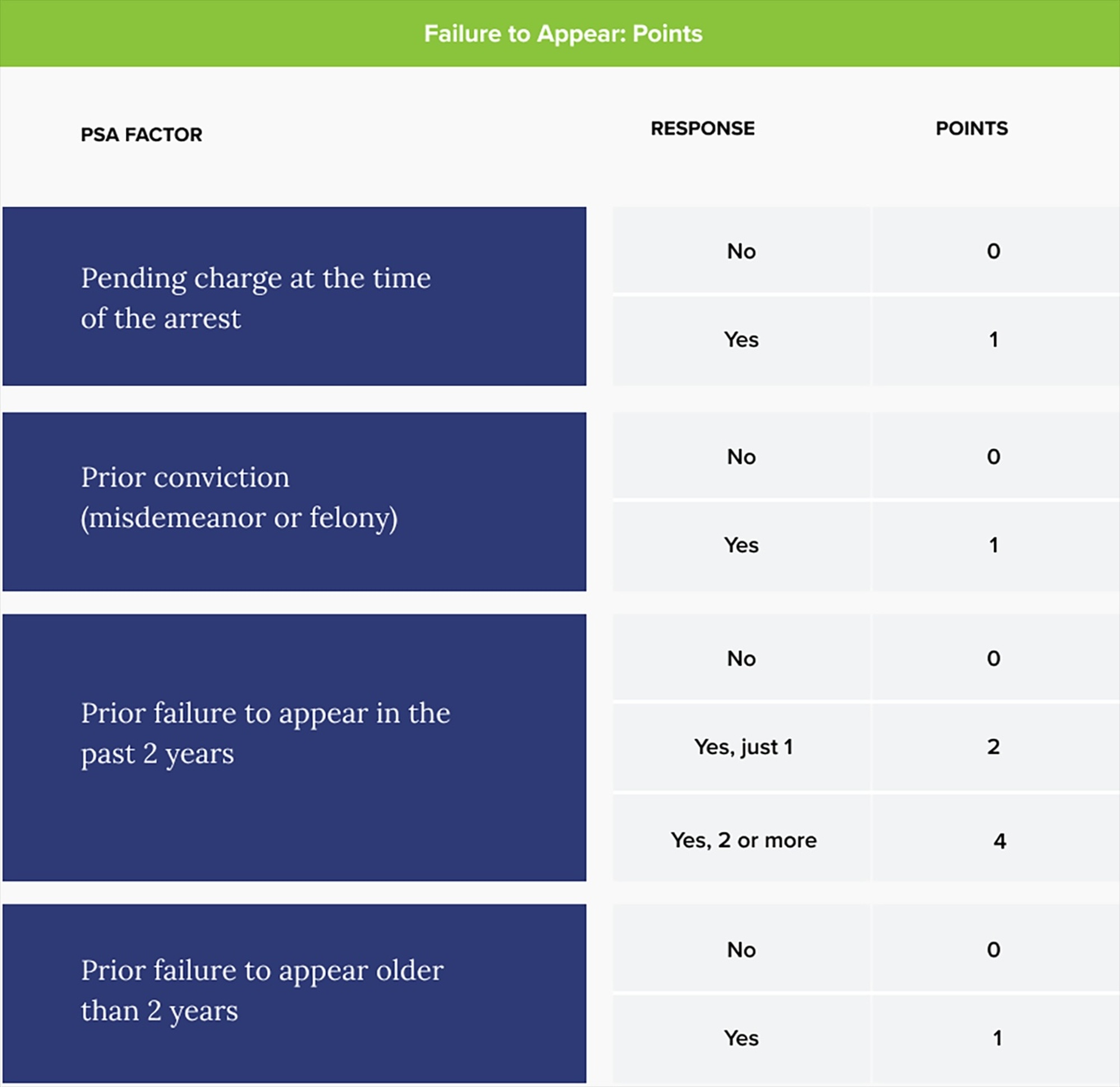 Each PSA factor is weighted and assigned different points according to the strength of its relationship with the specific pretrial outcome. At the end of the assessment, the points for each pretrial outcome are totaled. The total points assigned to FTA and NCA are then converted to two separate scales ranging from 1 to 6. Lower scores indicate a greater likelihood of pretrial success. The points assigned to NVCA are converted to a scaled score and then to the presence or absence of a “violence flag." The tables below show how the PSA assigns points to the factors and then converts them to scaled scores.