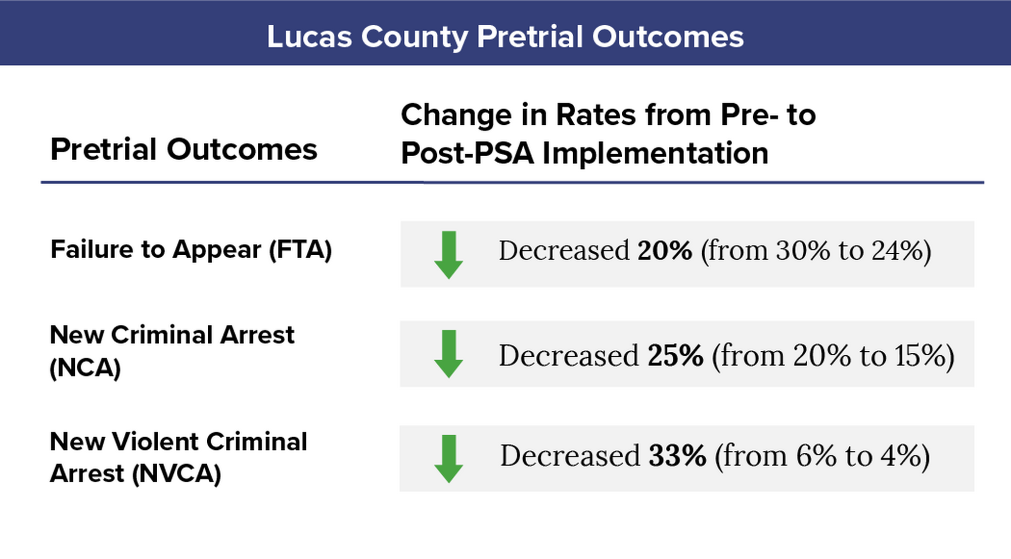 - Jail Population Review: Lucas County launched a jail population review team that meets weekly to look at who is in jail and to identify people—based both on charge and PSA scores—who can be released, either by modifying their release conditions or by expediting resolution of their case.