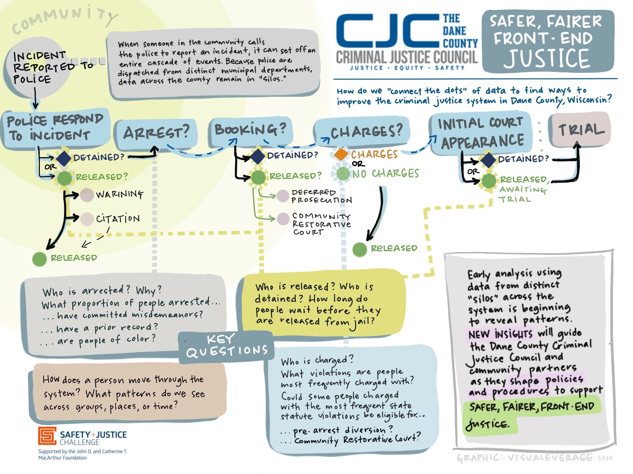 As a follow-up to the listening sessions, the CJC developed a two-page overview of the county’s pretrial system for public education. The CJC also created a one-page graphic flowchart depicting the possible steps and outcomes from the time an incident is reported to police through the resolution of a case. The sessions directly contributed to the graphic flowchart, which tried to synthesize the questions raised by community participants.
