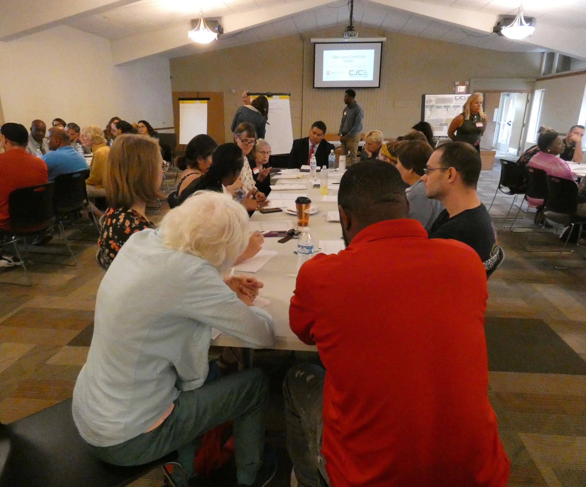 Some community participants had personal experience with the criminal legal system; others were advocates or simply interested residents. At each session, the institutional stakeholders were at different tables and would sit with groups of community members. Each table also had a notetaker and a facilitator. The groups of participants would move from table to table until they had talked with all three represented organizations.
