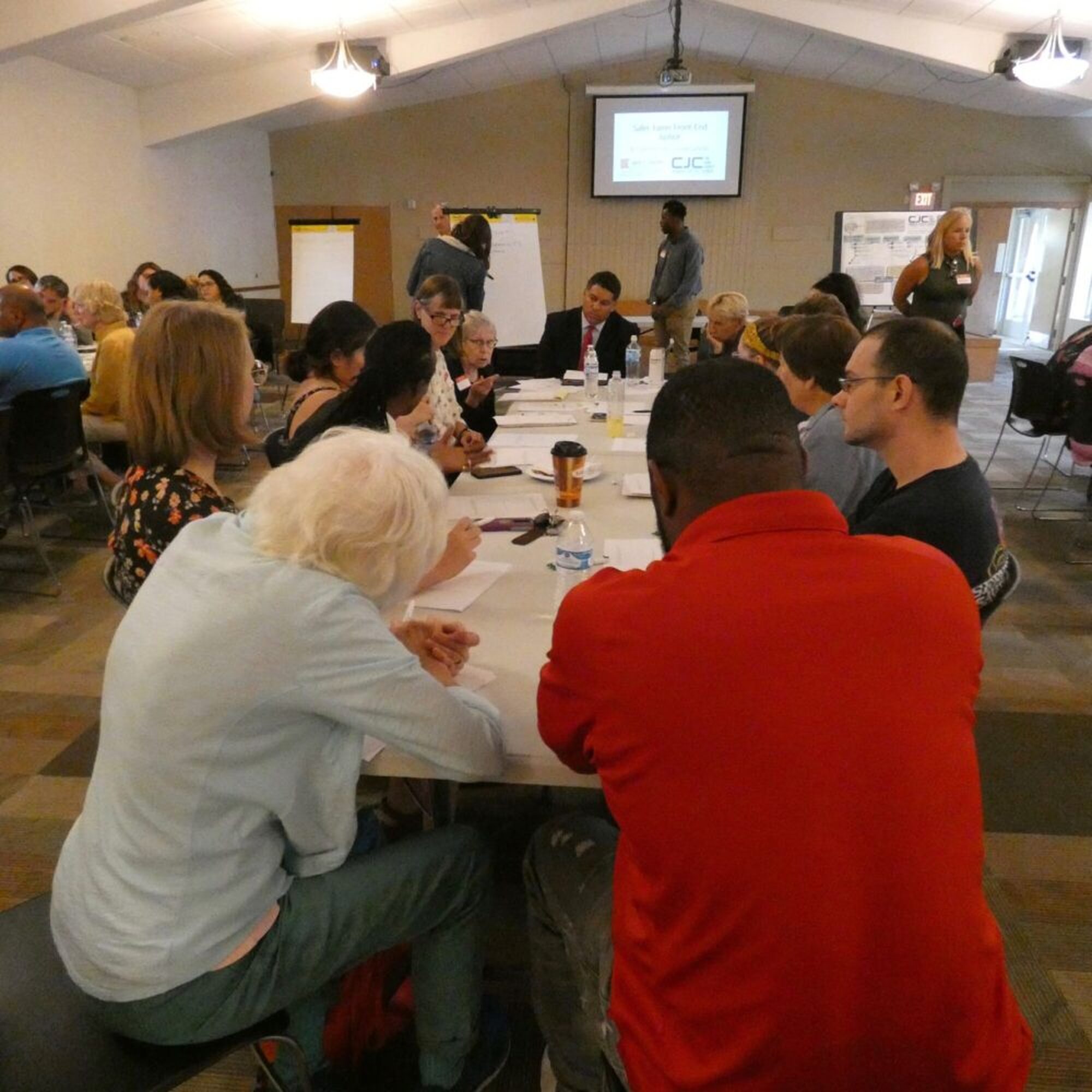 Some community participants had personal experience with the criminal legal system; others were advocates or simply interested residents. At each session, the institutional stakeholders were at different tables and would sit with groups of community members. Each table also had a notetaker and a facilitator. The groups of participants would move from table to table until they had talked with all three represented organizations.